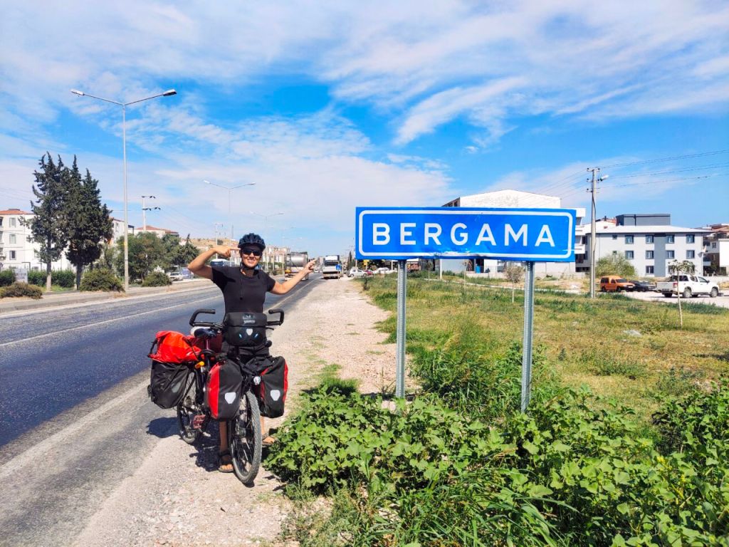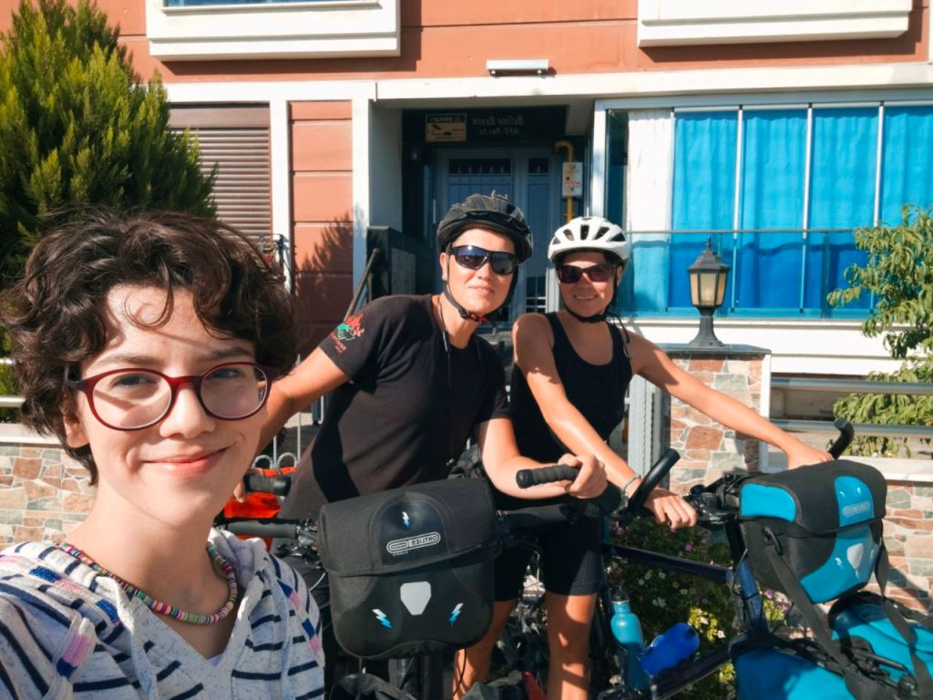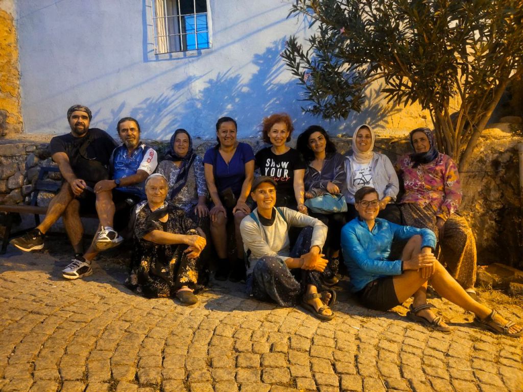 Und besonders angenehm an unserem Aufenthalt in Bergama: Über Warmshowers fanden wir Emine. Sie leitet den örtlichen Fahrrad-Club und organisiert auch sonst viele Rad-Events mit ihren Freund:innen. Gleich am ersten Abend zogen wir mit vielen anderen Radbegeisterten durch die Altstadt. Die anderen waren aufgedreht wie die Teenager und wir hatten sehr viel Spaß. Eine Gans wurde aus einem Garten zu einem Fotoshooting herausgeholt, Trauben aus einem Garten gesammelt, mit alten Frauen, die vor ihren Häusern saßen, geschäkert…
