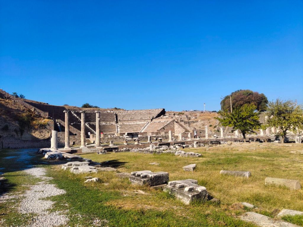Fast noch schöner fanden wir das Asklepieion, eine alte Reha-Klinik. Tauchbecken, lange Gänge, Säulenstraßen und sogar ein Theater waren noch prächtig erhalten. Wir konnten uns sehr gut vorstellen, wie es dort wohl einst war, Patient:in zu sein. Von dem Heilwasser haben wir natürlich auch ein Schlückchen probieren müssen.