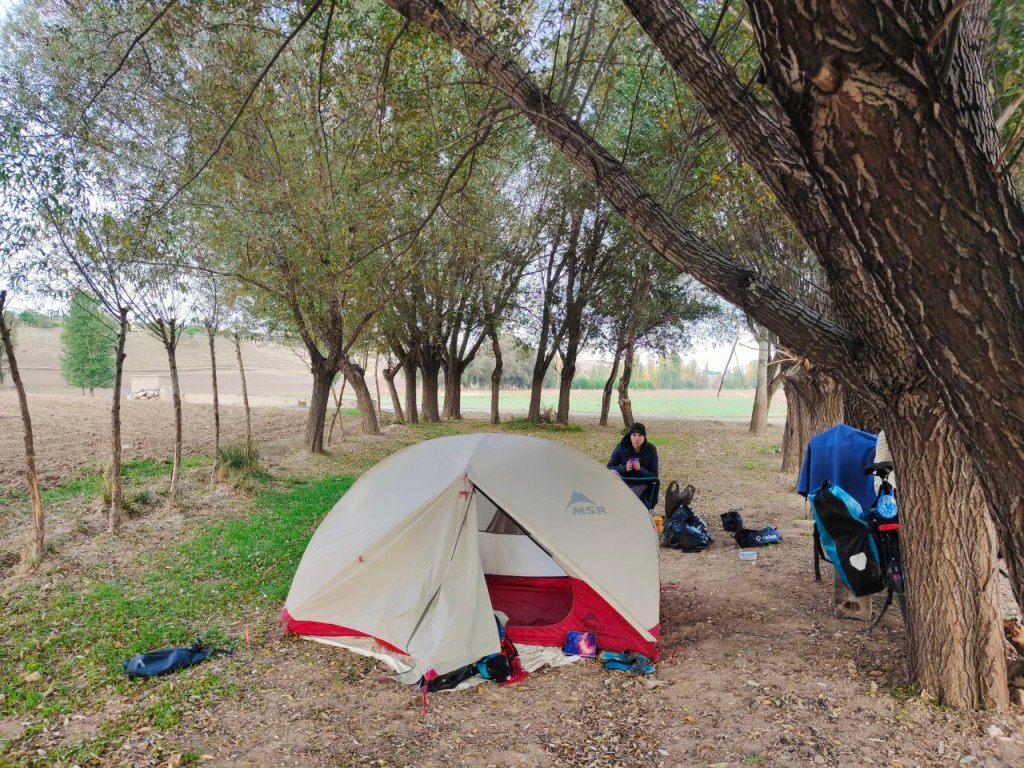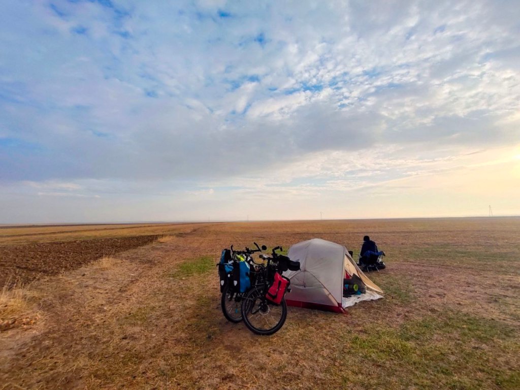 Das war Krisenmanagement erster Güte. Denn wir hatten uns nach 5 Tagen strampeln durch karge, abgeerntete Felder, einem defekten Handy (und wir haben doch sonst keine Technik dabei 😨), ganz motiviert in ein übles Gewitter manövriert. Der Blick auf das noch übrig gebliebene Handy verriet, im Umkreis von 50 km gab es keine Unterkunft und Dank des anhaltenden Starkregen waren die angrenzenden Feldwege so matschig, dass eine Zeltplatzsuche unmöglich schien.