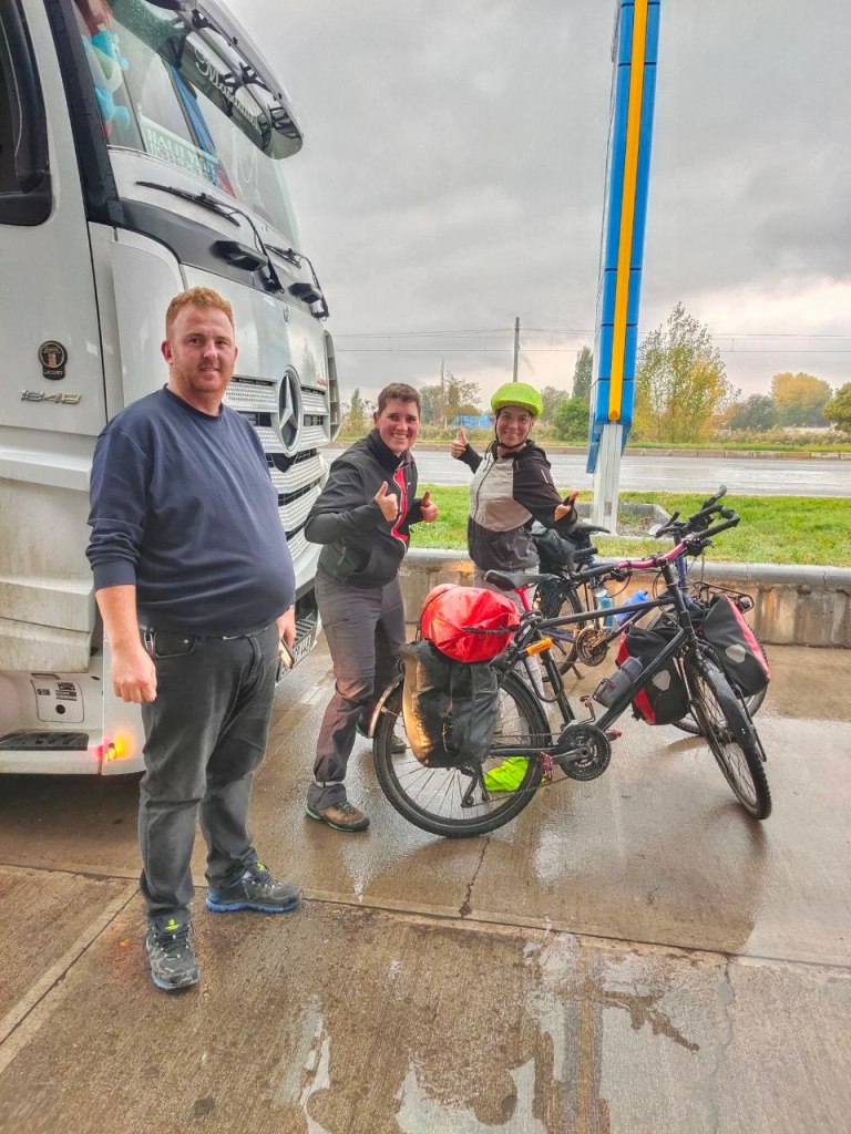 Also standen wir triefend und winkend an der Schnellstraße. Doch 1,2,3 … schon nach einer Minute hielt ein wunderbar trockener, warmer und riesiger LKW, der unsere Räder samt Gepäck ganz einfach aufladen konnte. Was für eine Rettung! Wir sind versucht, mehr mit bequemen Trucks zu reisen… ist irgendwie schneller und einfacher.😂