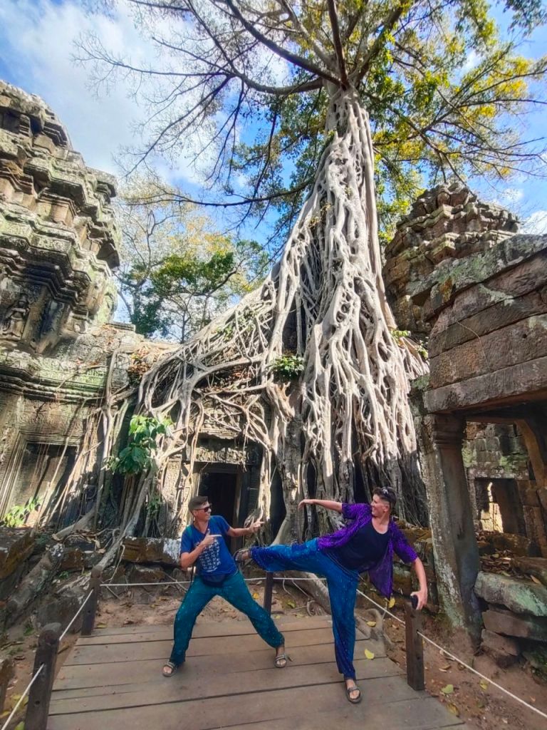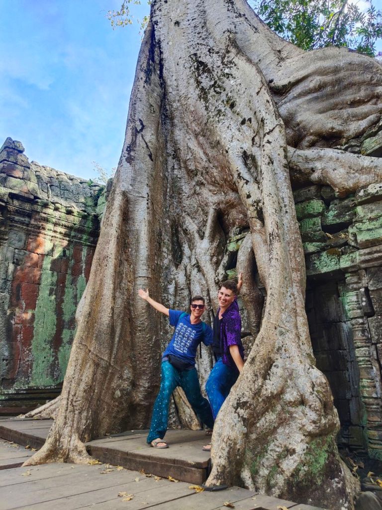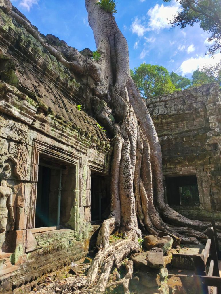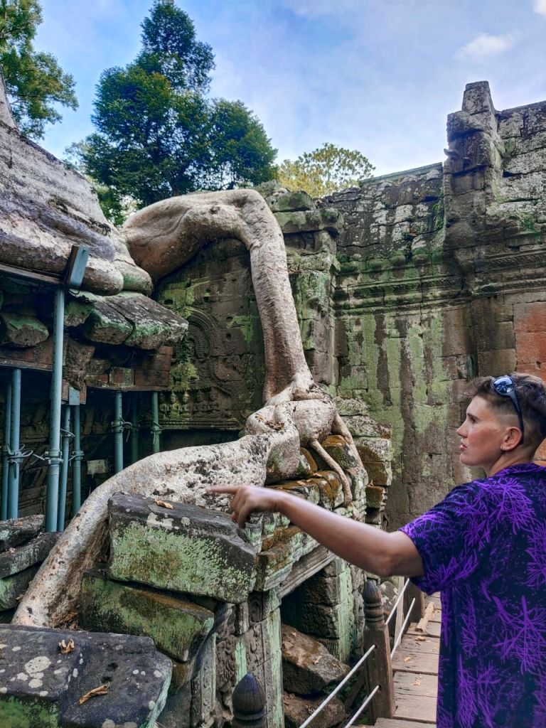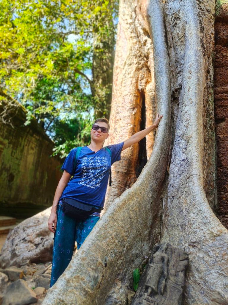 Zur Vorbereitung haben wir nicht nur einige Podcasts gehört, sondern auch den alten „Tomb Raider“ Film (2001) mit Angelina Jolie als Lara Croft geschaut, die wild in Ta Prohm wütet. Wir dagegen waren in diesem buddhistischen Tempel aus dem späten 12. Jhd. ganz verblüfft von der Kraft der Natur. Denn hier erobern mittlerweile riesige Bäume mit Brettwurzeln die Hinterlassenschaften alter Zivilisationen zurück.