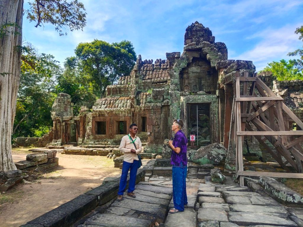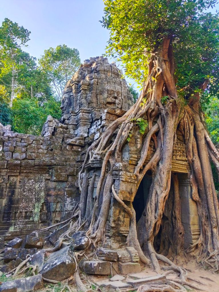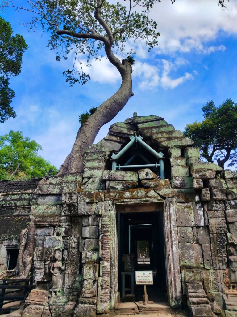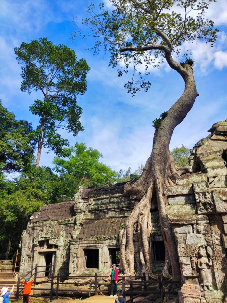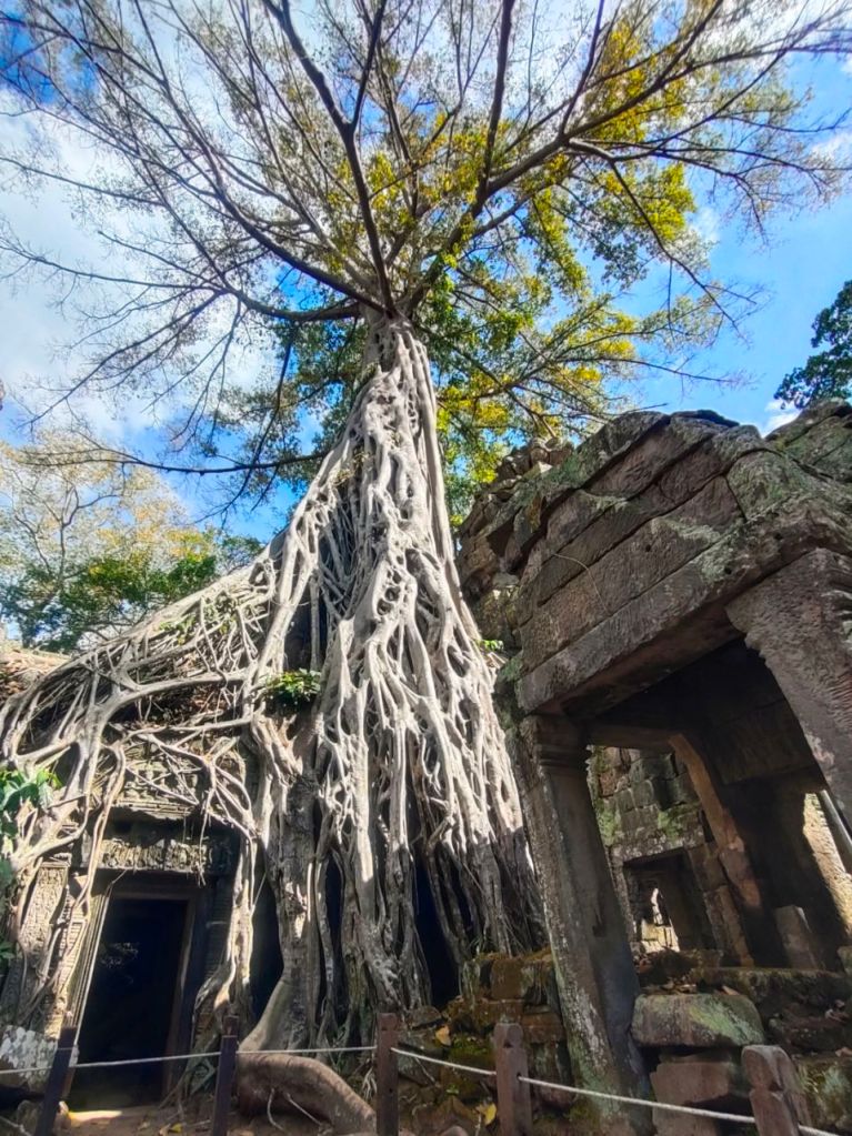 Zur Vorbereitung haben wir nicht nur einige Podcasts gehört, sondern auch den alten „Tomb Raider“ Film (2001) mit Angelina Jolie als Lara Croft geschaut, die wild in Ta Prohm wütet. Wir dagegen waren in diesem buddhistischen Tempel aus dem späten 12. Jhd. ganz verblüfft von der Kraft der Natur. Denn hier erobern mittlerweile riesige Bäume mit Brettwurzeln die Hinterlassenschaften alter Zivilisationen zurück.