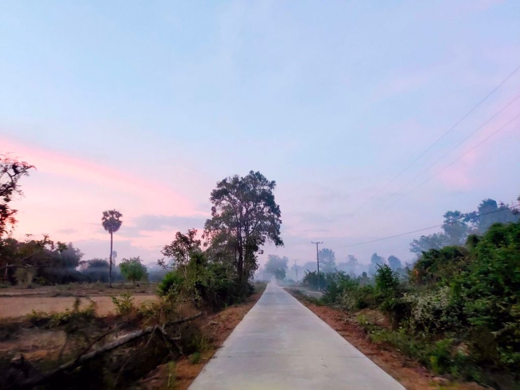 Nach einigem Suchen, fanden wir die wackelige Fähre: eine kleine Plattform, die auf zwei Barken montiert war. Fahrräder zu transportieren ist in Ländern, die hauptsächlich aus Mopedverkehr bestehen, meist kein Problem. Und auf der Insel wartete dann eine schöne Überraschung auf uns. Nach den ersten Metern Sandpiste, kamen wir auf einen kleinen perfekt betonierten Weg mitten durch die Natur. Die Sonne ging gerade bunt strahlend unter und leichter Nebel umwaberte die Palmen, Felder und Wasserbüffel. Wow! Sofort wich unsere schlechte Stimmung und ein absolutes Glückshoch setzte ein. Manchmal liegen die unterschiedlichen Emotionen doch sehr nah beieinander. Wir waren uns in dem Moment sicher, dass das eine der schönsten Strecken der Reise ist.