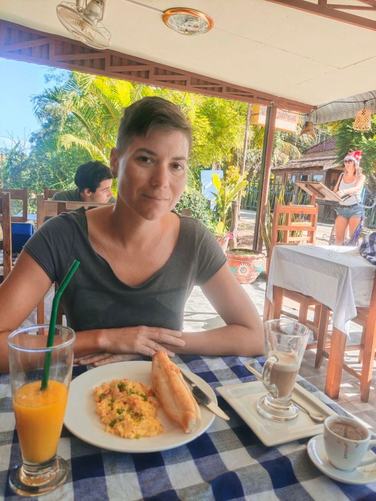 An unserem Gästehaus schloss sich ein kleines süßes Restaurant an und so konnten wir in unseren schicken neu erworbenen Outfits aus Kambodscha endlich unser Weihnachtsfestmahl genießen. Cocktails, Nachtisch, frische Smoothies und Salat, durften diesmal zum Essen nicht fehlen. Wir schlemmten glücklich… aber erschöpft! Und erstaunt stellten wir fest, dass die Preise in Laos bisher die niedrigsten in Südostasien waren.