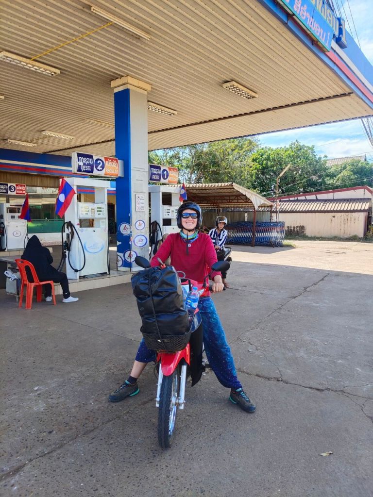 Totz mehrmaligen Verlängern, irgendwann mussten wir weiter. Unser nächstes Ziel: die 150 km entfernte Stadt Pakse. In der Stadt selbst gibt es nicht allzuviel Aufregendes. Das eigentlich Interessante: das Bolaven Plateau ganz in der Nähe. Plateau klingt nach Höhe? Richtig. Und zwar ganze 1.200 m und so beschlossen wir, wie die meisten Touris, eine 4 Tages Tour mit dem Moped zu machen. Dana fuhr unsere halbautomatische Honda (und fühlte sich dabei wie eine echte Dyke on Bike), Anke klammerte sich hinten fest. Wir entschieden uns für die große Runde und fuhren 320 km über insgesamt 3.300 Höhenmeter – zum Glück mussten wir das nicht strampeln. Abgefahren für uns: Immer wieder sehen wir selbst kleine Kinder hinterm Steuer. Das Moped ist hier einfach das Transportmittel. Und in ländlichen Regionen gibt es keine andere Möglichkeit, zur Schule oder zum Minimarkt zu kommen. So werden wir bei unseren ersten vorsichtigen Touren mit unter von 8 bis 10-Jährigen überholt.