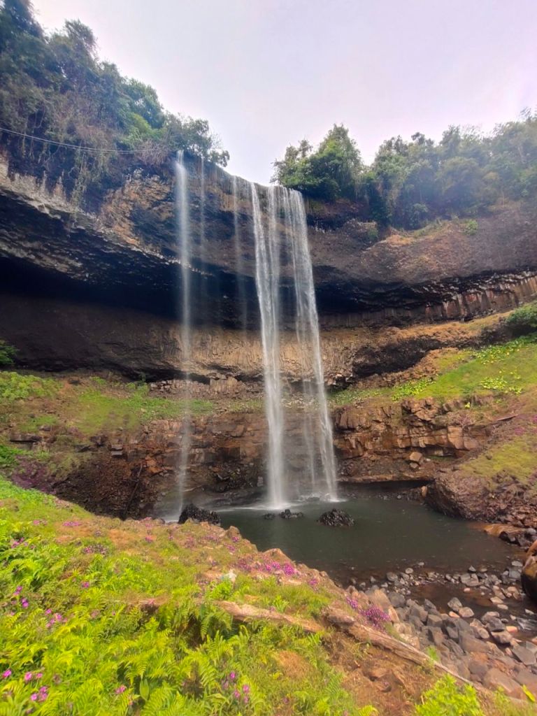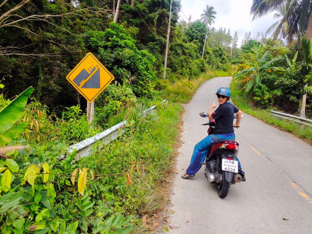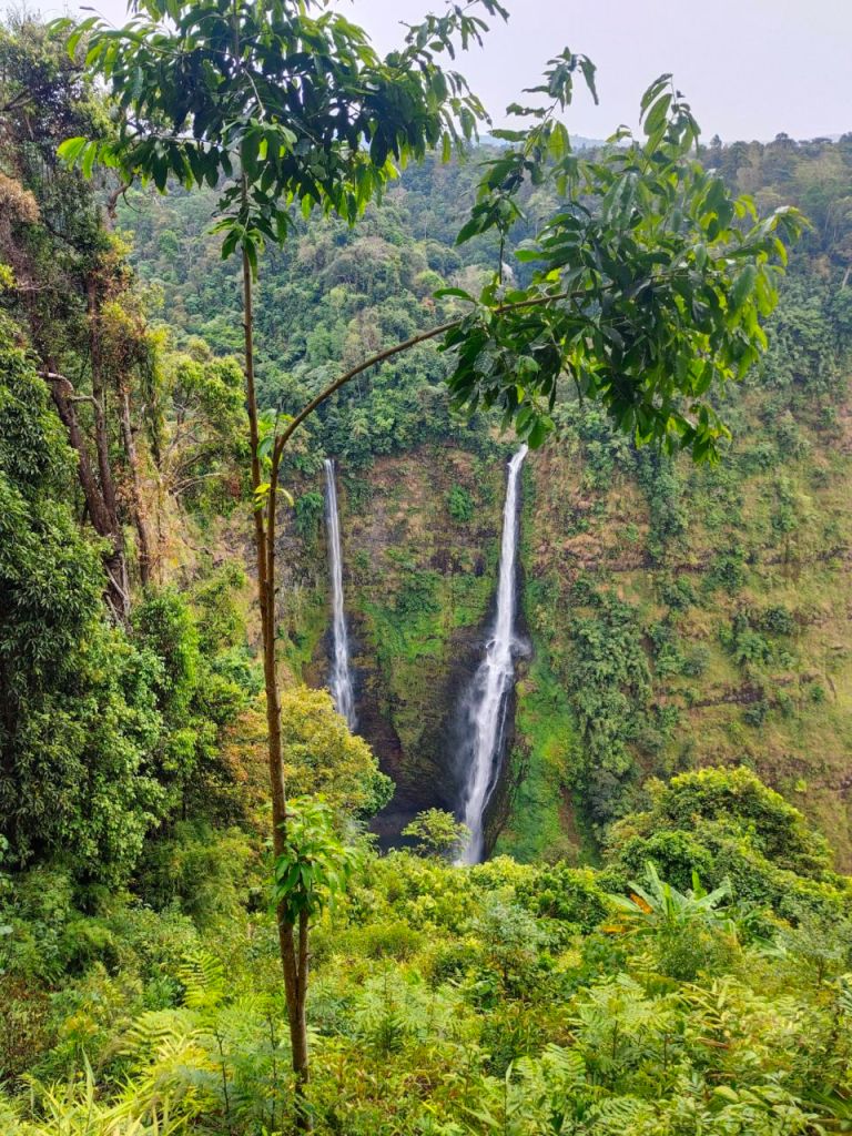 Während wir mit bis zu 70 km/h durch die grüne Landschaft cruisten, bewunderten wir den großartigen Ausblick! Regenwaldbehangene Hügel, weitläufige grüne Täler. Um das ganze noch schöner zu machen, verstecken sich überall malerische Wasserfälle. Fröhlich knatterten wir von einem Ausichtspunkt zum nächsten Naturspektakel. Dabei genossen wir es sehr, einmal nicht zu strampeln. Nur unsere Hintern konnten nicht so richtig entspannen. Statt gezielter Schmerzen an den Sitzhöckern, hatten wir nun großflächig verteilte Schmerzen. Naja, irgendwas ist ja immer. 😏