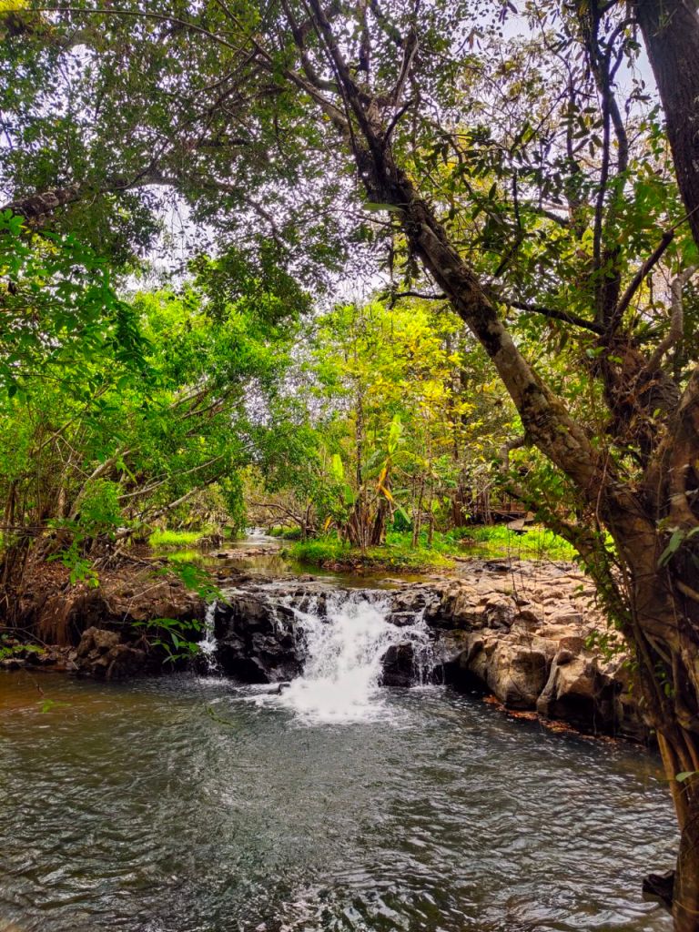 Die Inseln Don Khon und Don Det liegen mitten zwischen den Mekongwasserfällen. Diese sind die breitesten Fälle auf der Welt – sie erstrecken sich über ganze 10 km und überwinden in vielen Kaskaden eine Gesamthöhe von 21 Metern. Sie stellen damit noch heute ein unüberwindbares Hindernis für die Schifffahrt dar. Schon 1893 mussten die Franzosen sich für den Warenverkehr etwas einfallen lassen und bauten auf „unserer“ Insel und der Nachbarinsel eine 7 km lange Eisenbahnstrecke, um die Fälle zu umgehen. Don Khon und Don Det sind deshalb weiterhin durch eine kleine Brücke verbunden, während es die Eisenbahn schon seit 1941 nicht mehr gibt. Dafür ist die Strecke nun die fantastische Radstrecke, auf der wir am ersten Abend entlangfuhren.