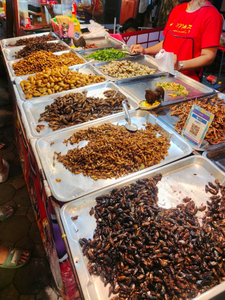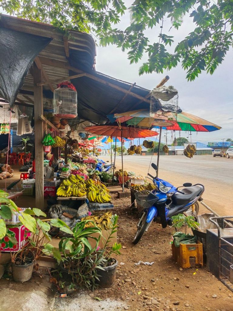 Thailand zieht sich über 1.700 km von Norden nach Süden und auch wenn wir nicht an der nördlichsten Stelle waren, lief uns leider etwas die Zeit davon. So radelten wir zur nächsten Zugstation in Ubon Ratchathani. Und mussten feststellen: Wir lieben Zugfahren in Thailand! Kaum angekommen, wurden wir von freundlichen Servicepersonal auf Englisch angesprochen, wie sie uns helfen könne. Schnell wurde eine passende Verbindung rausgesucht. Fahrräder? Gar kein Problem, es gibt ja schließlich einen Gepäckwagon, in dem auch Kühlschränke, Beutel voller riesen Kuscheltiere, Reissäcke und andere Waren transportiert werden. Auch hier gab es wieder helfende Bahnmitarbeiter, die unsere Räder verstauten und so konnten wir die Fahrt ganz entspannt genießen. Aber was waren wir für Anfängerinnen!!! Für unsere 550 km lange Fahrt kauften wir fleißig Verpflegung. Die Angst zu verhungern ist immer omnipräsent. Doch natürlich rannten die ganze Zeit Verkäufer:innen mit allerlei Köstlichkeiten durch die Waggons. Von gebratenem Hühnchen, über in Salat gewickeltes Surimi, hin zu Pudding und Bubble Tea gab es wirklich alles. Jede Menge uns Unbekanntes wurde natürlich auch wieder verkauft. 😱