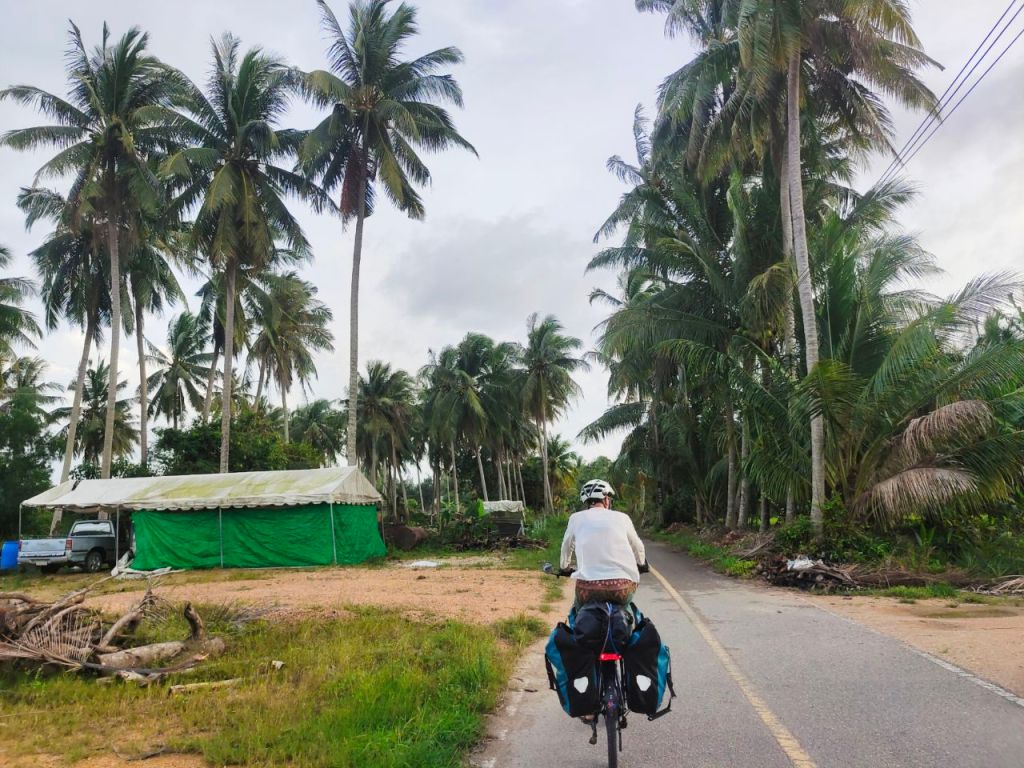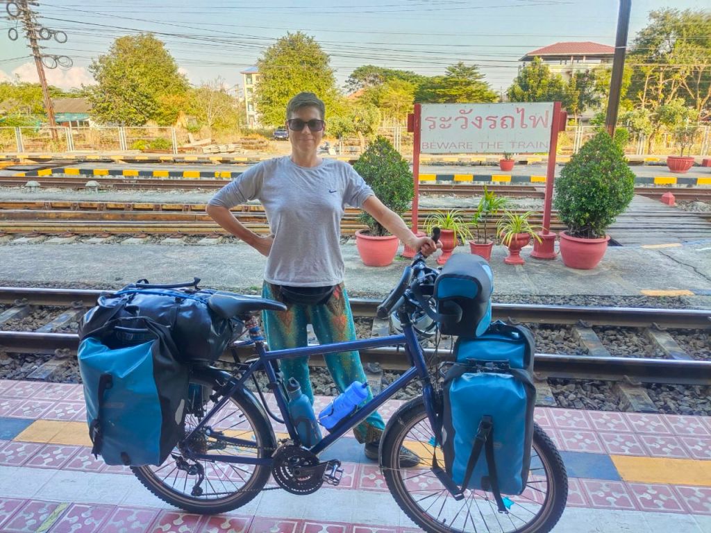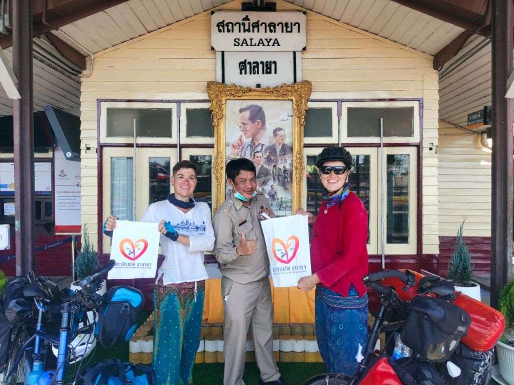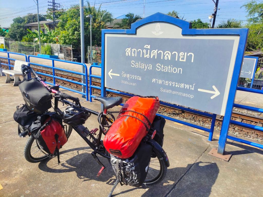 Anschließend sprangen wir wieder auf die Räder und radelten weiter Richtung Süden. Dabei mussten wir Bangkok umfahren. Herje, eine Strecke, die eher zu unseren schrecklichsten gehörte. Wir landeten auf vielbefahrenen Umgehungsstraßen mit gigantischen Kreuzungen, die mir zahlreichen Schleifen und Brücken durchzogen waren. Völlig undurchsichtig, als Radfahrende unnütze Höhenmeter, um auf Brücken zu fahren und risikoreiche Spurwechsel zu absolvieren. Wir fuhren gerade mal einen Tag und da Thailand eh immer noch zu groß war, sprangen wir schnell wieder in einen Zug, um weitere 440 km zu überspringen. Damit wir dann an der Küste des Golf von Thailands weiter radeln konnten. Diesmal bekamen wir am Bahnhof sogar einen Jutebeutel als Gastgeschenk und mussten Selfies mit dem Bahnmitarbeiter machen.