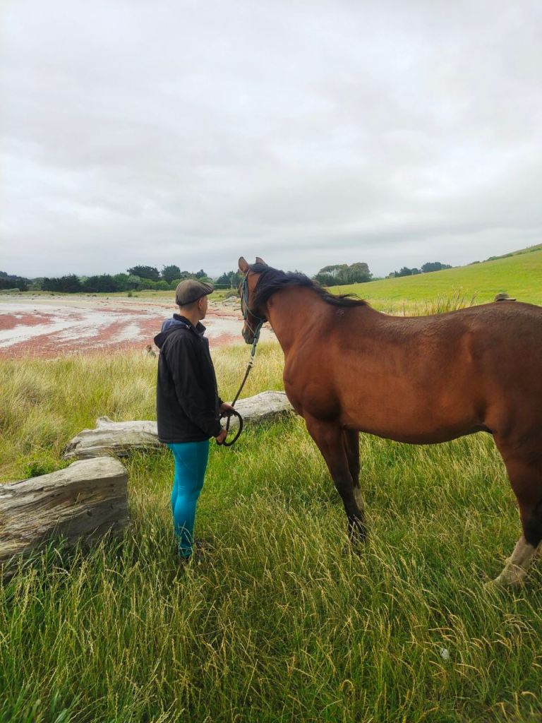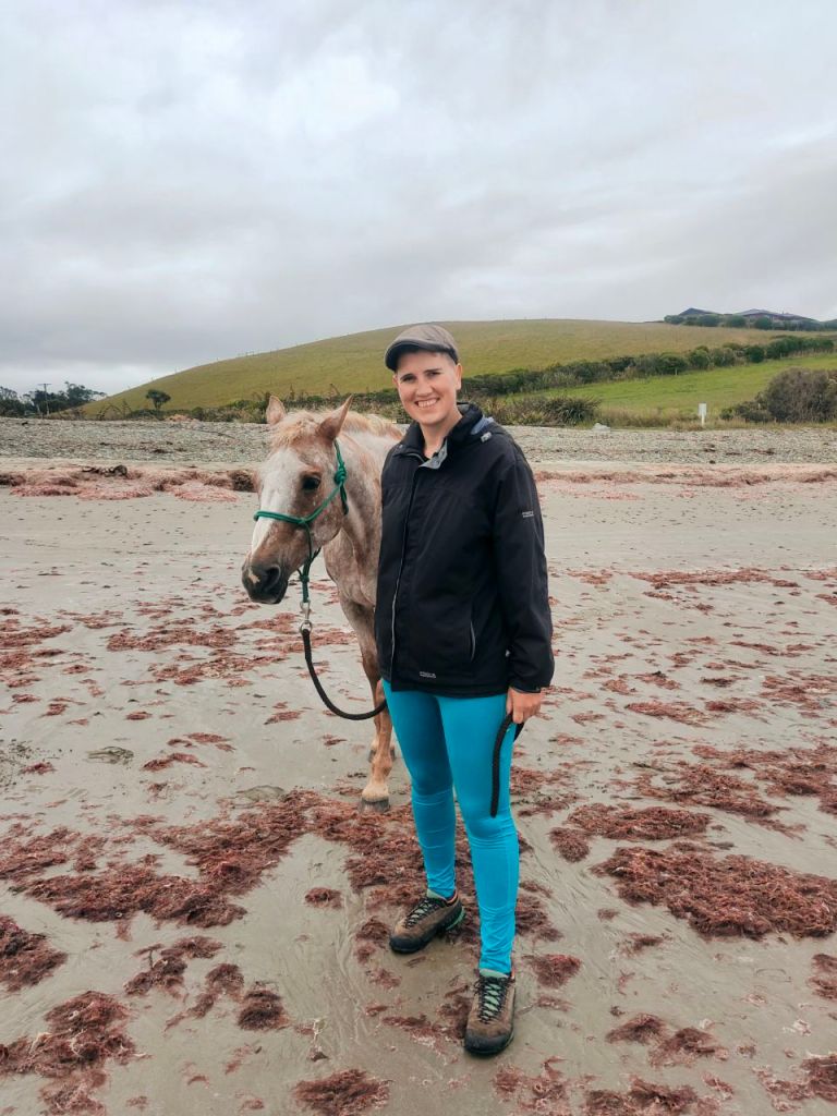 Juhu, Farm Nummer 3! 🐎🧑🌾 Wir sind auf unserem nächsten Wwoofing-Hof (auf der Südinsel von Neuseeland) angekommen. Hier ging es sogleich mit den Pferden zum Strandspaziergang, denn das Grundstück liegt direkt am Meer. Und so war Dana sogar schon surfen, während Anke fleißig im Permakulturgarten half.
