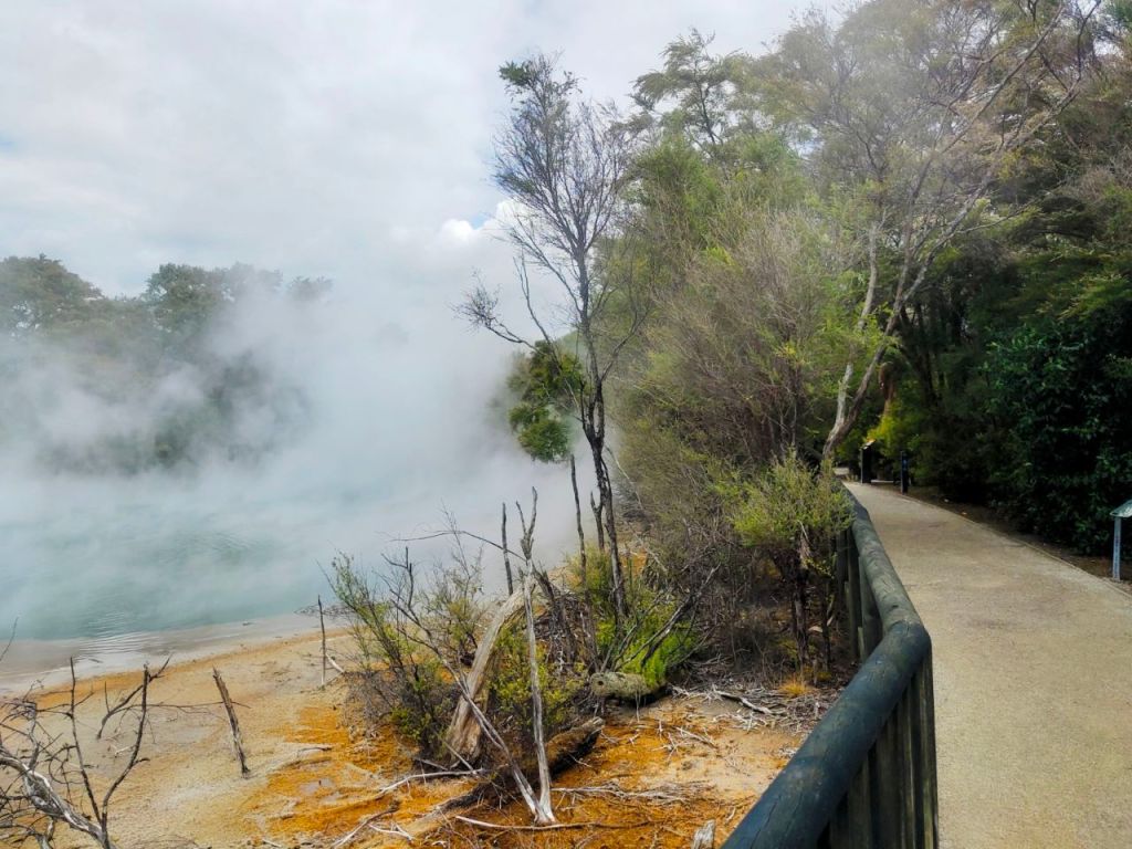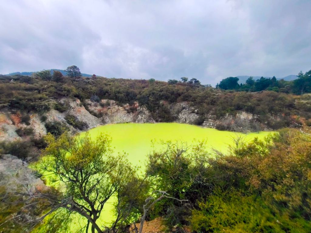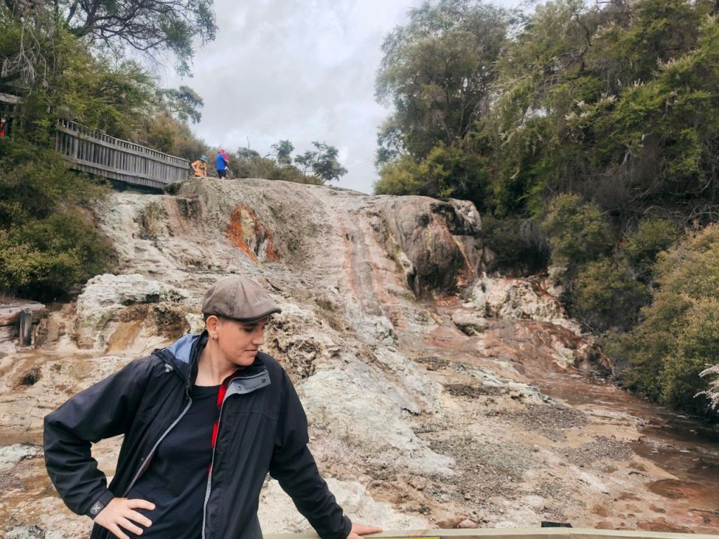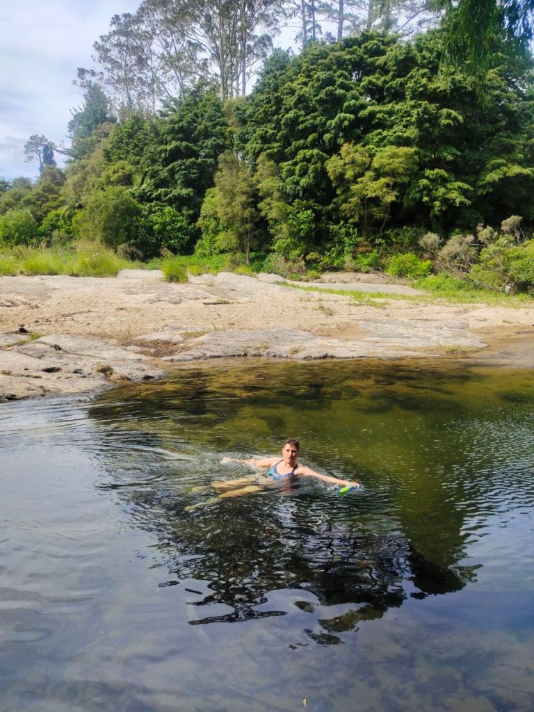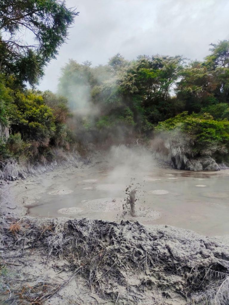 Am nächsten Wochenende ging es dann nach Rotorua, bekannt für die geothermalen Aktivitäten – sprich jede Menge Hotpools, brodelnde Schlammlöcher, heiße Quellen und schwefelige Ablagerungen. Wir tauchten buchstäblich in eine andere Welt ab und badeten sogar in einem heißen Fluss mitten im Wald. Was für eine abgefahrene Erfahrung, unter einem warmen Wasserfall zu sitzen und in den Wald zu schauen. Auch unser Campingplatz lag direkt an einer heißen Quelle und so dümpelten wir glücklich in diversen Pools herum.