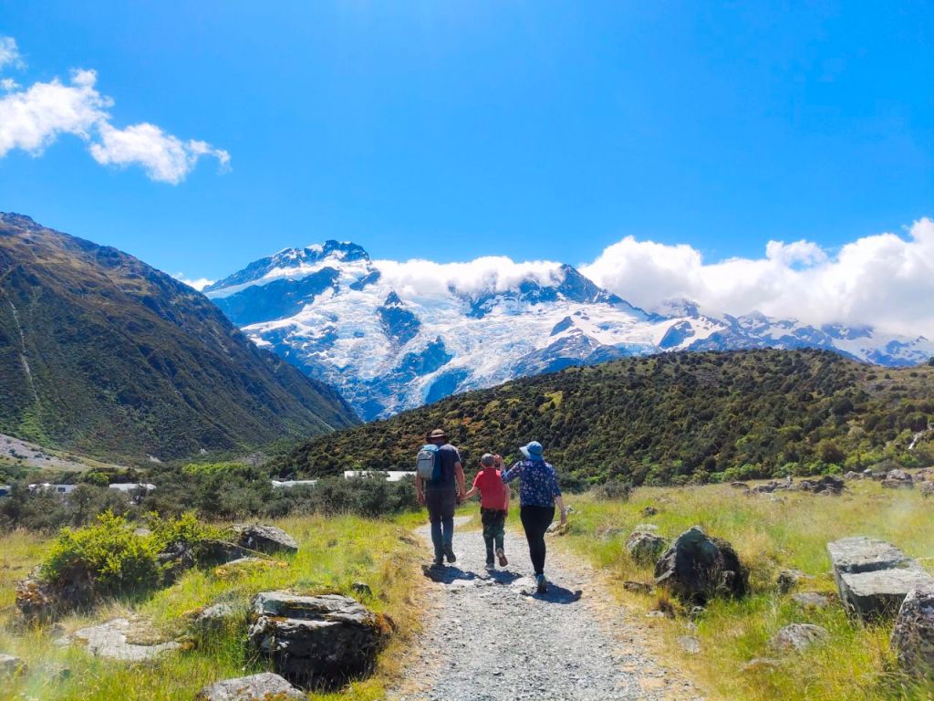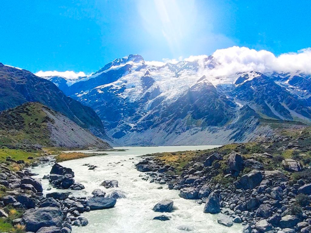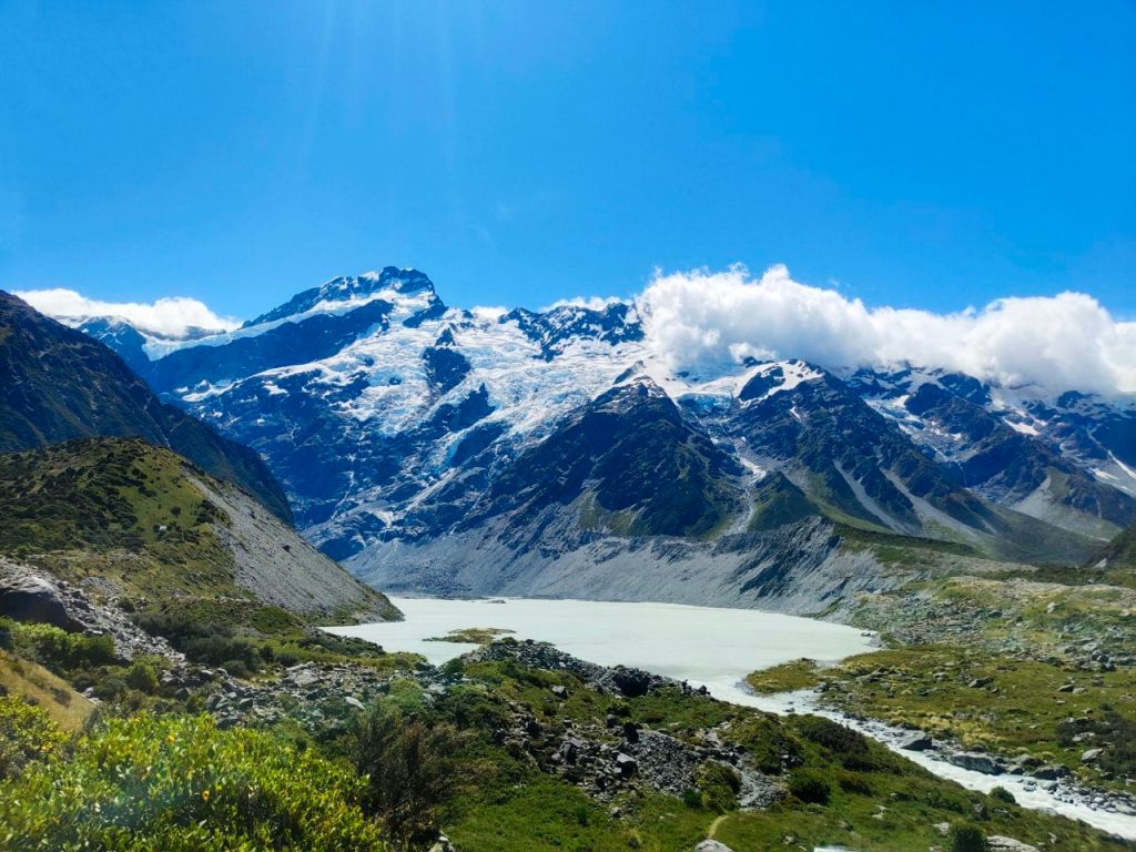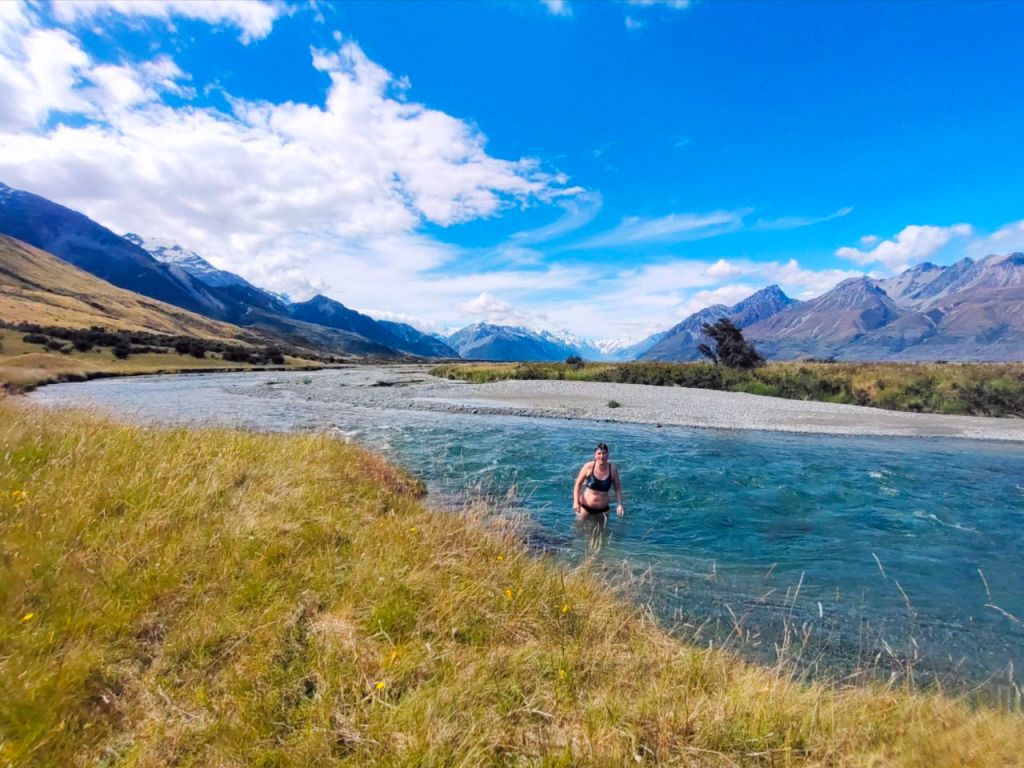 Auf dem Rückweg zu Farm holte uns netterweise unsere Gastfamilie mit dem Auto auf halber Strecke ab und machte mit uns einen kleinen Abstecher zum Mt.Cook, dem höchsten Berg Neuseelands. Gut, wir haben ihn nicht bestiegen, dafür zu seinen Füßen gepicknickt und im kalten Gletscherfluss gebadet. Brrr…