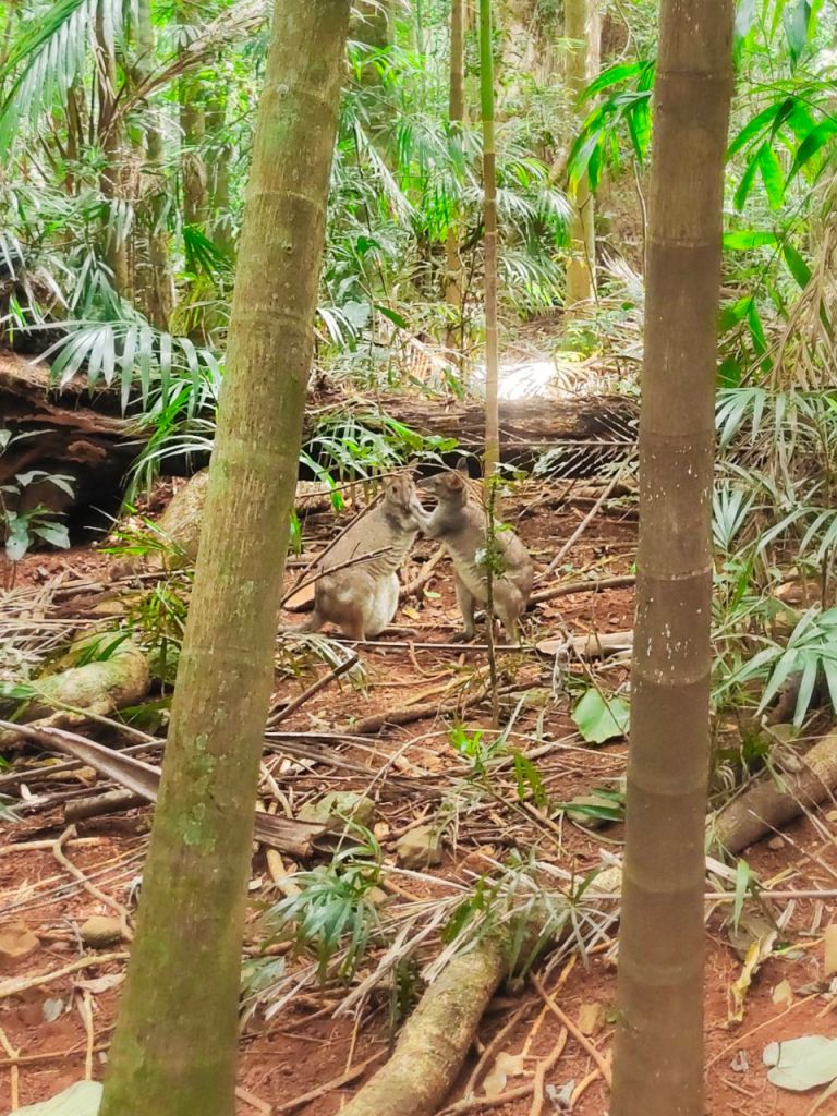 Wir genossen die Gastfreundschaft so sehr, dass nur Dana einmal das Zentrum der Metropole besuchte. Und sie war begeistert! Mitten zwischen Wolkenkratzer befand sich noch immer ein Stück Regenwald (der Eco Forest) – sozusagen die Lunge der Stadt. Gemeinsam besichtigten wir dann noch die berühmten Batu Caves. 15 km nördlich der malaysischen Hauptstadt befinden sich gigantische Kalksteinhöhlen. In einer gibt es einen der bedeutendsten Hindu-Schreine außerhalb Indiens. Gewidmet ist er dem Gott Murugan, jenem Gott, der zu Thaipusam verehrt wird. Zu der 100 m hohen Höhle führen 272 bunt angemalte Stufen. Diese haben es in sich. Unsere Muskeln, die außer Radfahren keinerlei Ausgleichsbewegung mehr gewohnt sind, beschwerten sich schnell. Also keuchten wir uns mit den Massen nach oben, aber wie schon so oft konnten wir uns glücklich schätzen, dass der Tourismus noch nicht auf dem Präcorona-Niveau angekommen ist. Die Höhlen sind beeindruckend und drinnen bewunderten wir neben den fantastischen Naturschauspiel die bunten Tempel, um die ein paar freche Äffchen sich begeistert von Touris füttern ließen.