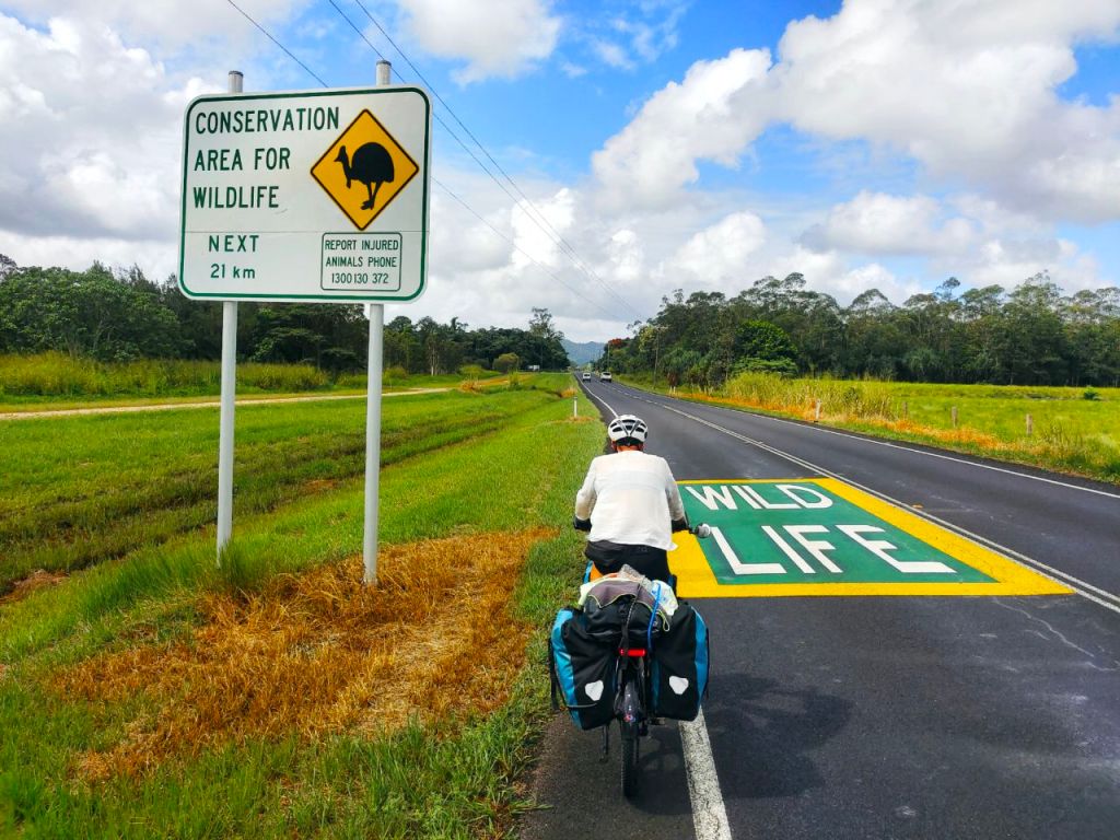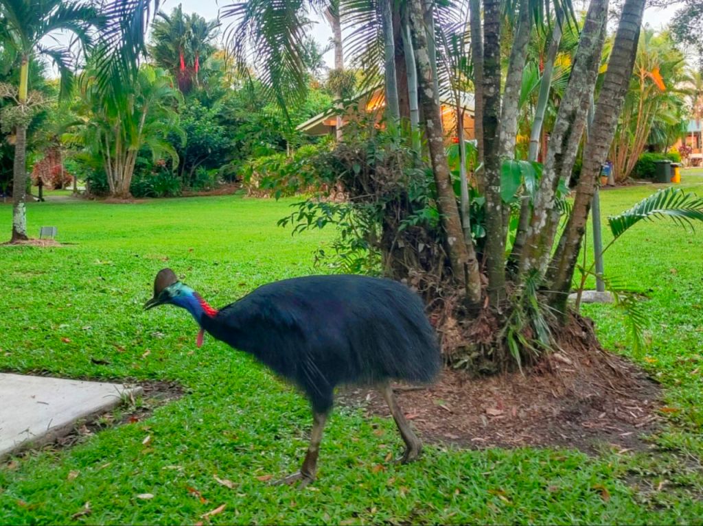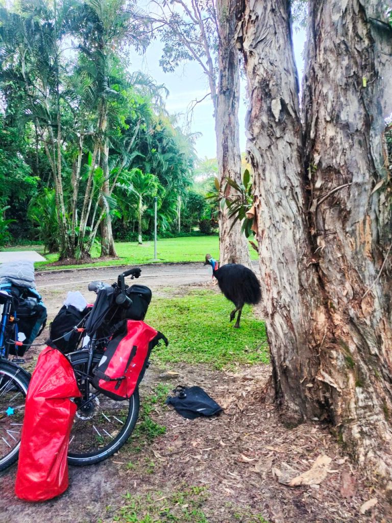 Wow, wir sind im wilden Norden Australiens angekommen.🌴🐊🌏 An der Nordspitze Queensland lauern ganz neue tierische Gesellen auf uns. Während wir unser Zelt auf einem Campingplatz in Mission Beach aufbauten, stand plötzlich ein ganz schön großer Kasuar direkt hinter uns. Neugierig betrachtete es unsere Räder und zog friedlich von Dannen, während wir gefangen zwischen Furcht und Faszination verharrten. Die Weibchen können schließlich bis zu 2 Meter hoch werden!