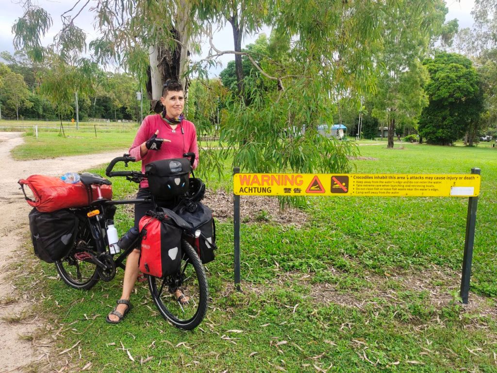 Und noch furchteinflößender: Umso nördlicher wir radeln, umso mehr Krokodil-Schilder entdecken wir. Sogar am Eingang eines Campingplatzes steht die übliche Warnung: „Achtung! Krokodile leben in diesem Gebiet. Angriffe können zu Verletzungen oder zum Tod führen“ … Ähm. Gut. Bisher haben wir noch keine erblickt, aber die „Local Crocs“ sollen bis zu 5 Meter lang sein! 😱 Doch die eigentlichen Gefahren sind viel kleiner. So ist unsere Zeltunterlage nach einem Termiten-Angriff durchlöchert und unsere Körper sind von unzähligen Mückenstichen übersät.🦟🐜